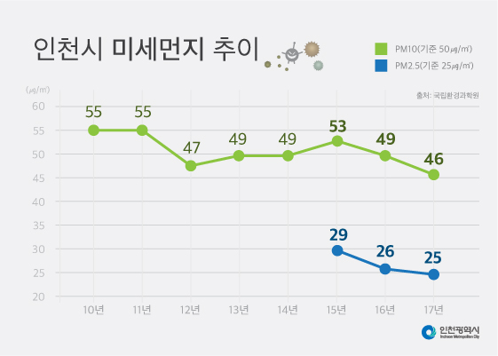 그 결과 2015년 53㎍/㎥이었던 미세먼지(PM10) 농도가 2016년 49㎍/㎥, 2017년 46㎍/㎥까지 낮아졌다. 초미세먼지(PM2.5)도 2015년 29㎍/㎥에서 2016년 26㎍/㎥로 줄고, 지난해에는 국가 기준인 25㎍/㎥까지 개선됐다.