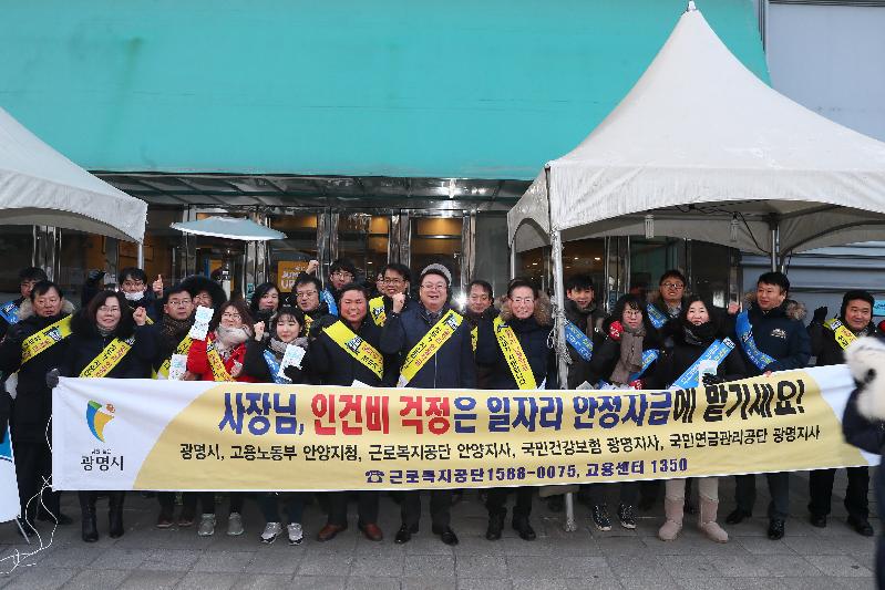 [미디어타임즈= 신훈종 기자] 광명시(시장 양기대)는 25일 지하철 7호선 철산역 입구에서 고용노동부 안양지청, 근로복지공단·국민연금공단·국민건강보험공단 광명지사 등 4개 기관과 합동으로 일자리 안정자금 홍보를 위한 가두 캠페인을 실시했다.