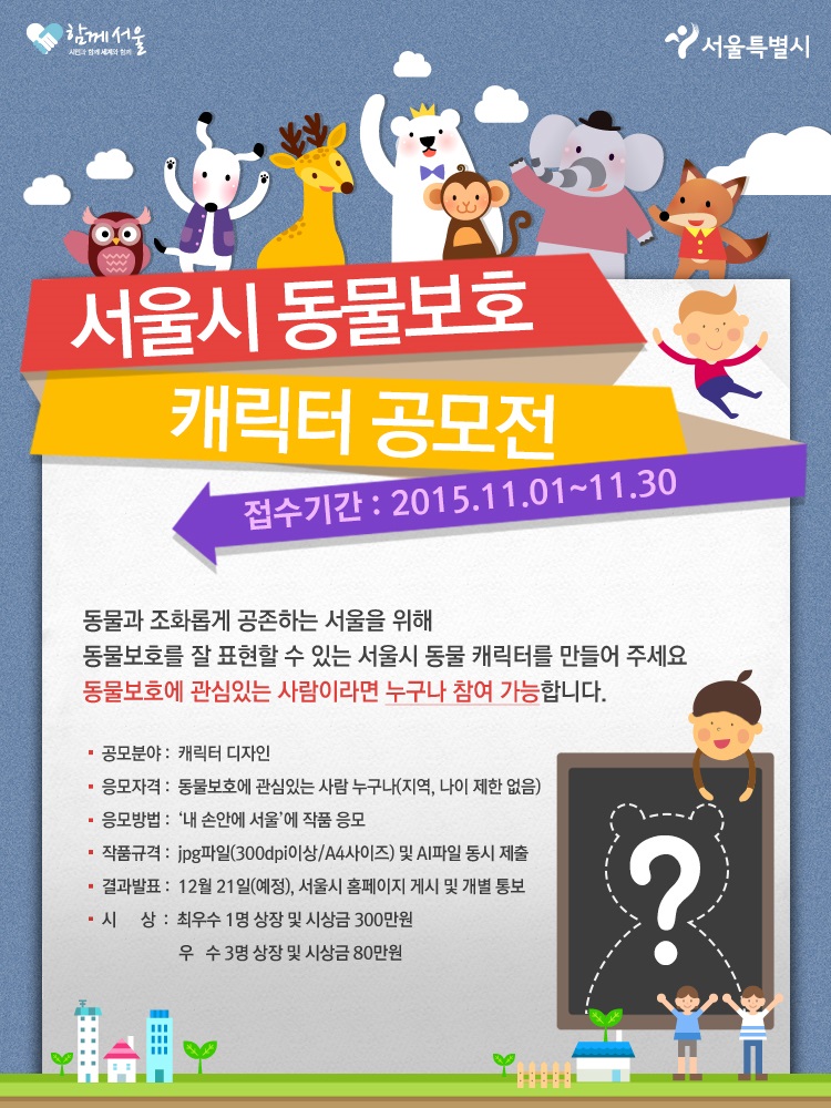 서울시는 동물보호에 대한 시민 공감대 형성을 위한 ‘서울시 동물보호 캐릭터 시민 공모전’을 11월 30일까지 실시한다.