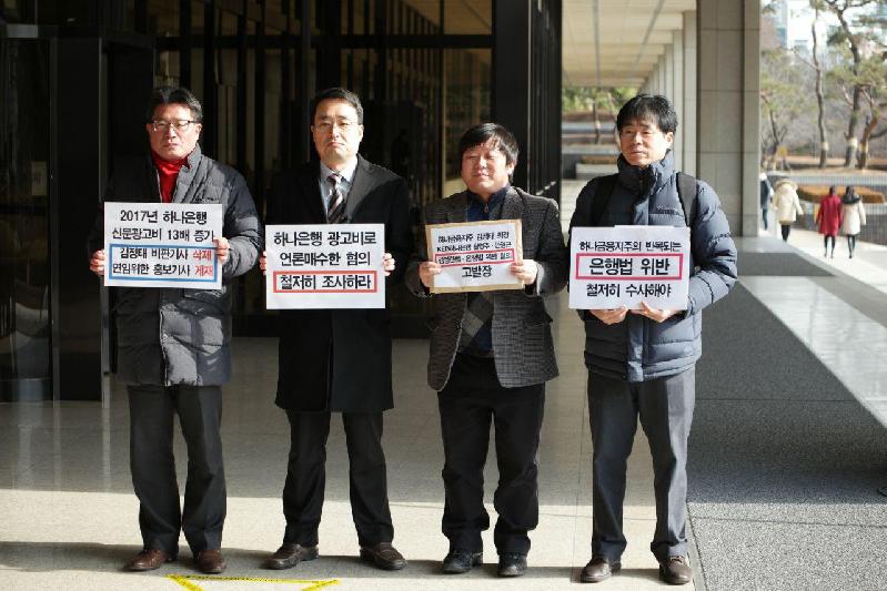 이들은 이날 검찰 고발은 “김정태 하나금융지주 회장은 자신과 하나금융그룹에 대해 비판적인 기사를 쓴 언론사와 기자에게 억대의 광고비와 하나금융 자회사의 임직원 자리를 제안하며 비판적인 기사를 쓰지 말 것을 회유했다.”며 “하나은행 광고비를 통해 기사 삭제·변경 압박 등 언론을 매수하고 유착 관계를 맺고자 했음이 드러난 것”이라고 주장했다.