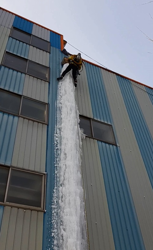 구조대는 현장에 도착하여 확인한 바, 건물 4층 건물의 3층 높이에 고드름이 달려있었고 길이는 약12m ,너비 1미터, 두께는 약 50cm였다. 이에 구조대원은 개인안전장비를 착용 후 로프를 이용하여 안전하게 고드름을 제거 완료하였다.