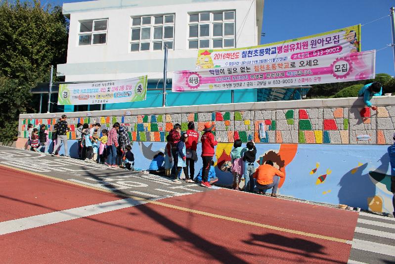 이번 벽화그리기 행사는 칠천초등학교와 자매결연을 맺고 있는 장미로타리클럽의 중계로 삼성중공업 벽화사업봉사단의 도움을 받아 실시되었다.