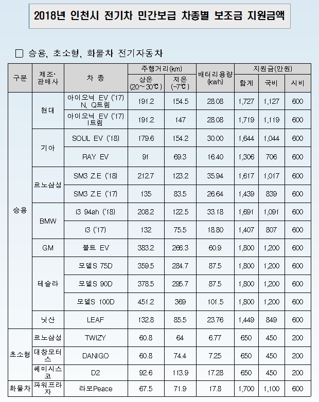 [미디어타임즈= 김광한 기자] 인천시 전기자동차 2018년 전기차 민간 보급사업 496대 확정