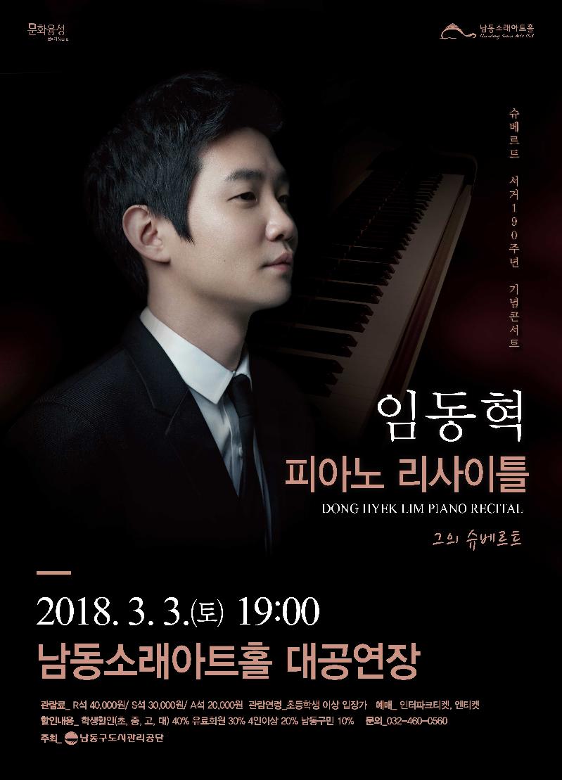 임동혁 피아노 리사이틀은 2018년 3월 3일(토) 오후 7:00 대공연장(소래극장)에서 열린다. 관람료는 R석, 40,000원 S석 30,000원, A석 20,000원이며, 만7세이상 입장가능(미취학 아동 입장불가)하다.