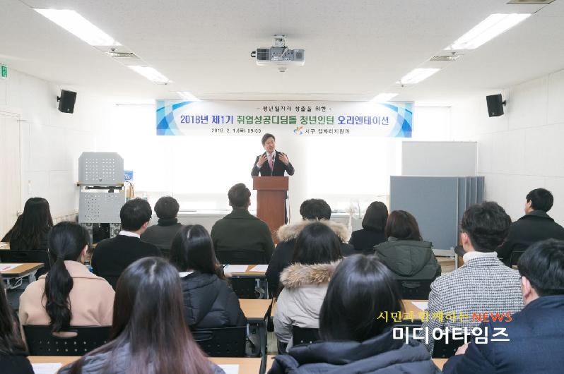 [미디어타임즈=문상수 기자] 인천시 서구(구청장 강범석)은 지난 1일 『취업성공 디딤돌 청년인턴 사업』을 시작하며 기업&일자리 지원센터 취업교육관에서 오리엔테이션을 실시했다. 이번 1기 청년인턴으로 최종 합격된 40명은 4월말까지 총 3개월 동안, 서구청 및 동 행정복지센터에서 행정인턴으로 주5일(6시간) 근무를 하게 된다.이번 ‘취업성공 디딤돌 청년인턴사업’은 행정인턴 근무 경력형성은 물론, 취업역량 강화 및 취업의지를 고취시켜 성공적인 취업을 지원하는 취업성공의 디딤돌로서의 사업이다. 서구는 취업역량강화 프로그램 운영을 통한 양질의 취업지원서비스와 전문직업상담사의 집중상담을 통해 지난해 청년인턴사업 참여자 50명 중 22명이 정규직 일자리로 취업하는 성과를 거두는 등 청년실업 해소에 기여하고 있어 주목받고 있다.올해에도 참여한 청년인재들이 좋은 일자리와 연계될 수 있도록 관내 우수기업과 함께하는 멘토링 특강 및 맞춤형 취업컨설팅도 함께 진행하며 청년들의 취업성공을 위한 견인차 역할을 할 것으로 기대하고 있다. 강범석 서구청장은 “청년 미취업자들이 취업성공 디딤돌 청년인턴 사업을 통해 자신의 능력을 마음껏 발휘하여 능력 있는 사회구성원으로 성장하길 바란다”고 말했다.