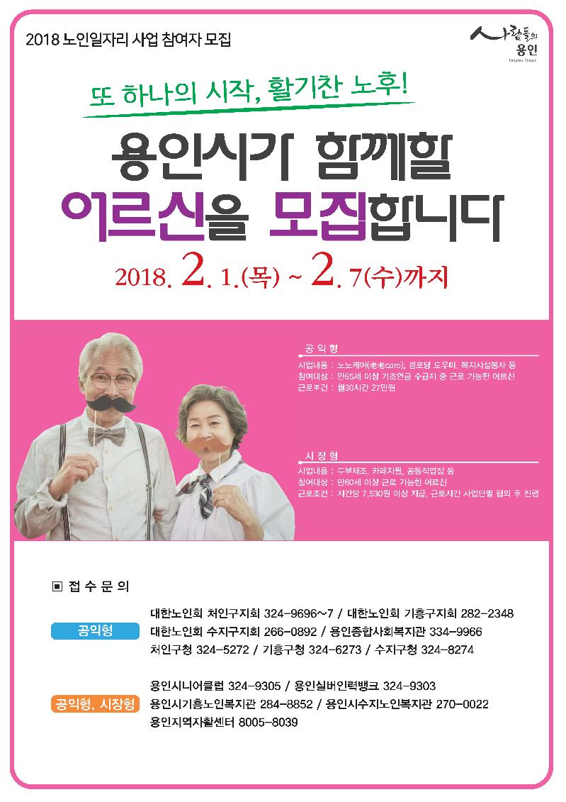 [미디어타임즈= 이옥수 기자] 용인시는 2018년 노인일자리사업 참가자 2,896명을 오는 7일까지 모집한다고 밝혔다.