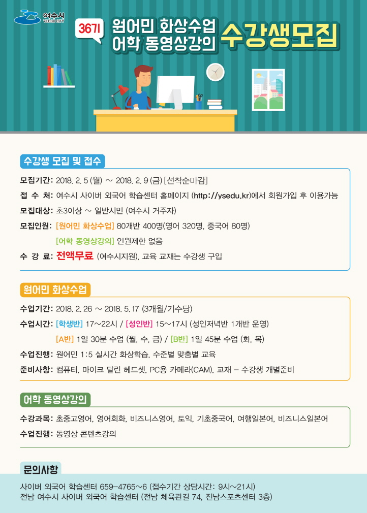 [미디어타임즈= 이운효 기자] 여수시가 제36기 원어민 화상학습 수강생 400명을 선착순 모집한다.