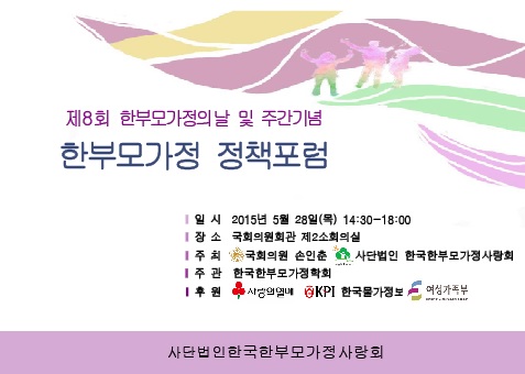 제8회 한부모가정의 날(5월24일) 및 주간을 기념한 정책포럼이 오는 28일 오후 3시부터 국회의원회관 제2소회의실에서 열린다.