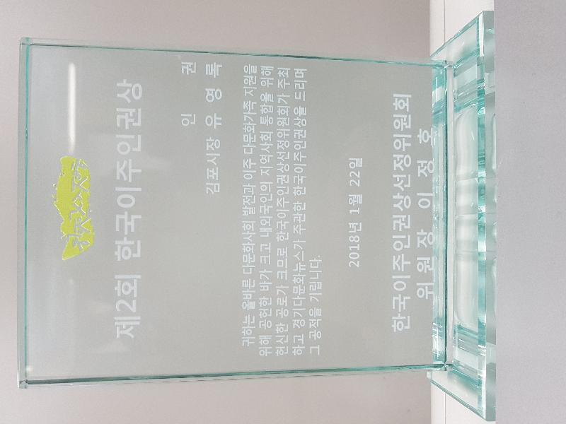 이날 시상식은 5개 분야(중앙정책, 지역정책, 인권, 교육, 이주민분야) 13명과 공로상 6명으로, 인권분야에서는 유영록 김포시장, 7년이상 다문화사회를 위해 헌신한 공로상에는 김연화 김포시다문화가족지원센터장이 수상했다.