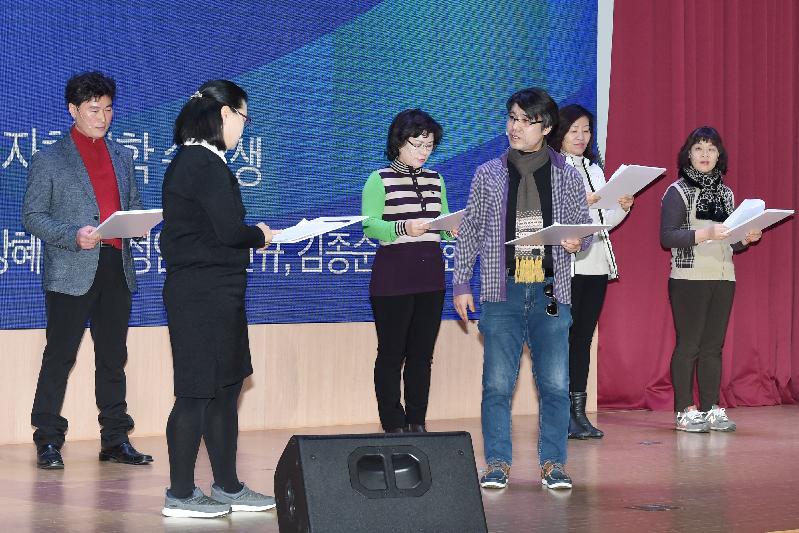 실제 있을 법한 이 이야기는 2일 수원시청 대강당에서 열린 ‘2월의 만남’(월례조회) 전 상연된 연극의 줄거리다. 연극배우는 ‘2017년도 3학기 시민자치대학’ 과정을 마친 수료생들이었다. 지난해 11월 열린 시민자치대학 수료식에서 발표한 연극이 좋은 반응을 얻었고, 수원시 요청으로 이날 무대에 다시 올린 것이다.