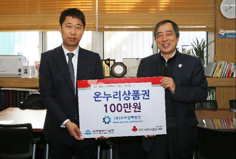 [미디어타임즈=문상수 기자] 설 명절을 맞아 어려운 이웃을 돕기 위한 나눔의 손길이 이어지고 있다.㈜우리경매법인은 5일 온누리상품권 100매(1만원권)를 인천 남구에 기탁했다.상품권은 사회복지공동모금회 지정기탁 과정을 거쳐 지역 내 저소득 세대에 전달될 예정이다.전달식에 참석한 조병천 대표이사는 “온정이 넘치는 설 명절을 지내고 싶은 마음에서 기탁하게 됐다”며 “지역사회 이웃들과 함께 더불어 따뜻한 명절을 보냈으면 좋겠다”고 말했다.박우섭 남구청장은 “지속적으로 주민들에게 온정의 손길을 나눠주눈 데 감사한다”며 “주민들이 행복한 명절을 보내는데 조금이라도 도움이 될 수 있도록 후원물품을 소중하게 전달하겠다”고 말했다.㈜우리경매법인은 지난해 추석과 연말에도 각각 라면 40상자와 온누리상품권 100만원을 남구에 기탁한 바 있다.