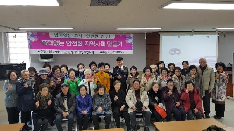이번 교육은 안성시와 안성시여성단체협의회(회장 이정옥)가 민․관 합동으로 추진하여 전준석 강사(안성경찰서 생활안전과장)를 초빙하여 개강식 특강으로 진행되었으며, 성폭력․가정폭력 등에 대한 사례 중심의 강의로 어르신들에게 큰 호응을 얻었다.