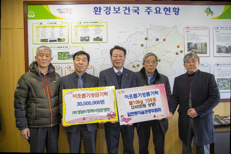 성남시는 이날 오전 10시 30분 시청 5층 환경보건국장실에서 임한규 성남시장례식장운영회 대표이사, 유성희 갈현동마을공동위원회 위원장, 신경천 성남시 환경보건국장 등이 참석한 가운데 ‘이웃돕기 성품 기탁’ 행사를 했다.