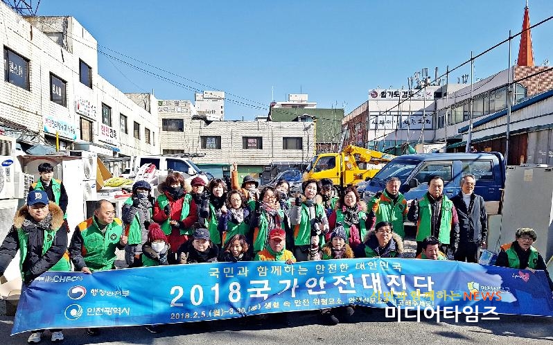 [미디어타임즈=문상수 기자] 인천 계양구(구청장 박형우)는 지난 5일 작전시장 일대에서 국가안전대진단 홍보를 위한 ‘제263차 안전점검의 날 캠페인’을 실시했다.이번 캠페인은 계양구청과 계양소방서가 함께 진행하여 관계 공무원을 비롯하여 지역자율방재단, 안전모니터봉사단, 의용소방대 등 60여 명이 참여했으며 ▲국가안전대진단 진단 대상 ▲소유·거주 시설물 자율 안전점검표 안내 ▲생활 속 안전 위험요소를 신고하는 ‘안전신문고’ 홍보 등의 활동을 펼쳤다.구 관계자는 “2018 국가안전대진단은 2월 5일부터 3월 30일까지 54일간 중앙부처와 지자체, 공공기관뿐만 아니라 모든 국민이 참여하여 사회 전반의 안전관리 실태를 점검하고 개선하는 예방활동”이라며, “구민들은 거주하고 있는 시설물의 안전관리 상태를 자율적으로 점검하고 생활 속 안전 위험요소는 ‘안전신문고’를 통해 신고해 달라”고 당부했다.