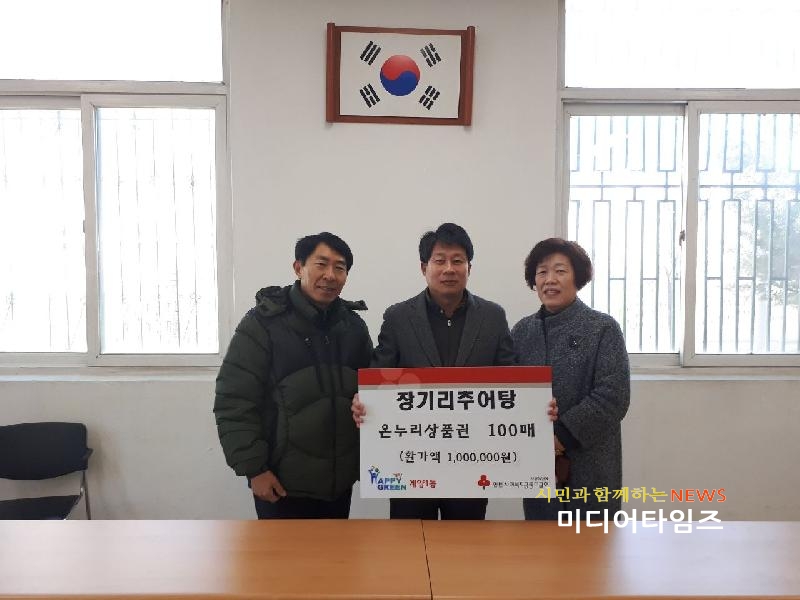 [미디어타임즈=문상수 기자] 인천 계양구 계양1동 소재 장기리추어탕(대표 이상연, 김음전)은 지난 5일 관내 어려운 이웃에게 전달해 달라며 온누리상품권과 적십자 특별회비를 계양1동 주민센터(동장 김태영)에 기탁했다.이날 기탁 받은 상품권은 100만 원 상당으로 관내 저소득 가구에 전달할 예정이다.장기리추어탕 김음전 대표는 “작지만 관내 취약계층 등 어려운 이웃에게 소중한 도움이 되길 바란다”라며 “매년 지속적으로 불우이웃 돕기를 하여 더불어 사는 행복한 계양1동을 만들겠다”고 지원 의사를 밝혔다.또한, 남편인 이상연 씨는 현재 계양1동 3통장을 맡고 있으며, 적십자회비 모금활동에 적극 동참하고자 재해구호, 저소득층에 대한 구호, 무료급식소 운영 등 지역사회 욕구에 부응하는 다양한 봉사활동에 쓰이게 될 적십자 특별회비 100만 원을 기탁하여 기부 문화 확산에 이바지 하였다.