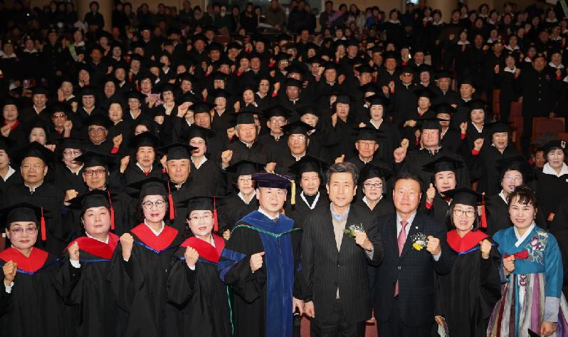 [미디어 타임즈 = 배수남 기자] 포항시가 6일 평생학습원 대강당에서 143명의 졸업생과 재학생, 가족 등 550명이 참석한 가운데 제1회 신중년사관학교 졸업식을 가졌다. 이날 졸업식에는 이강덕 포항시장과 권영해 前국방부장관 등 많은 내빈들이 참석해 졸업을 축하했다. 식전행사로 1기생들의 4년간 학과수업 활동과 운동회, 수학여행, 작품발표회, 자원봉사활동을 담은 영상을 상영해 졸업식의 의미를 더하고 그동안의 추억을 되돌아보는 시간도 가졌다.