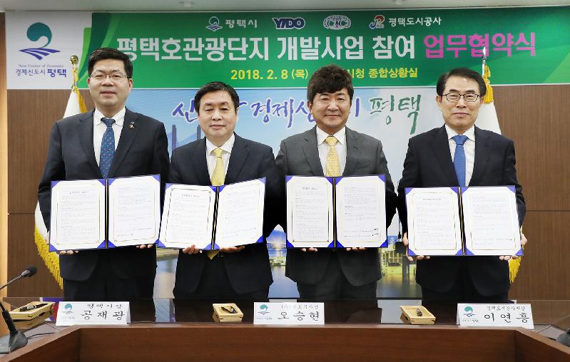 이날 협약은 평택호를 서해안 관광 메카로 조성하기 위한 초석으로 관광단지 내 입지 집객시설인 키즈파크(㈜플레이앤케어)와 관광호텔(㈜이도)을 조성하는 양해각서(MOU) 체결이다.