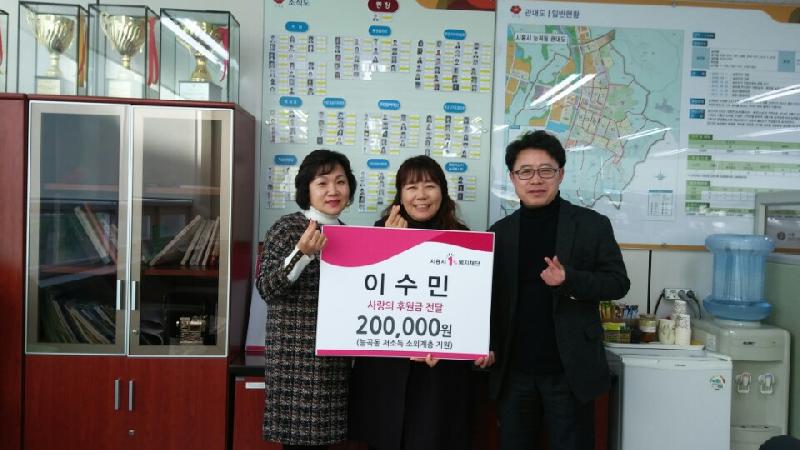 [미디어타임즈= 신훈종 기자] 시흥시 능곡동 희망드리미협의체 이수민 위원(능곡동 자원봉사센터장)이 지난 7일자 정기후원 외에 20만 원의 후원금을 시흥시1%복지재단을 통하여 ‘능곡동 지역사회보장협의체(희망드리미협의체) 기금’으로 추가 지정 기탁했다.