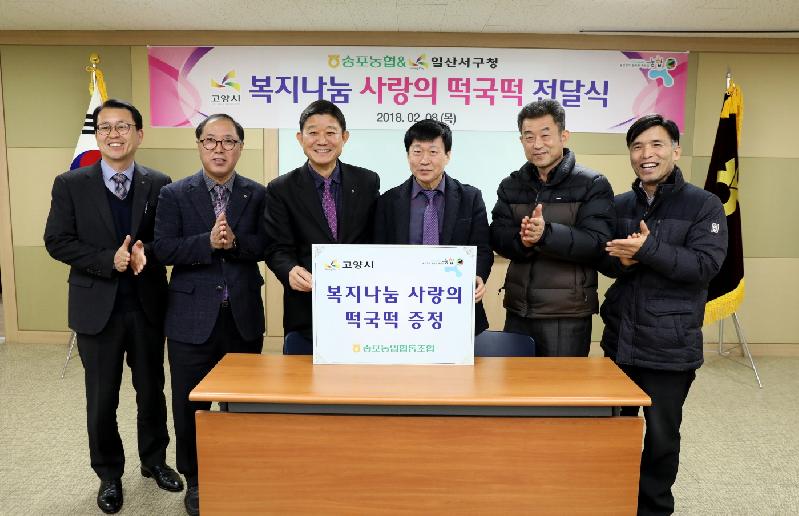 [미디어타임즈= 이옥수 기자] 고양시(시장 최성) 일산서구는 지난 8일 관내 송포농협(조합장 이재영)과 복지나눔 1촌 맺기 사업의 일환으로 떡국 떡(4kg 100개) 전달식을 가졌다.