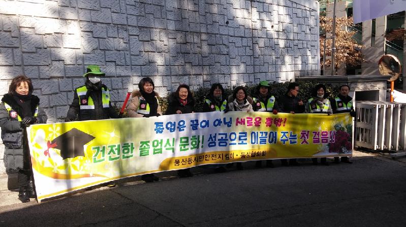 그간 풍산동 주민센터에서는 매년 졸업 시즌 때마다 관내 중·고등학교의 건전한 졸업 문화 정착을 위해 다양한 캠페인을 전개해 왔다. 올해도 강압적 졸업식 뒤풀이 근절 및 졸업이 끝이 아닌 새로운 시작임을 알리기 위한 행복한 졸업문화 홍보활동을 적극적으로 펼쳤다.