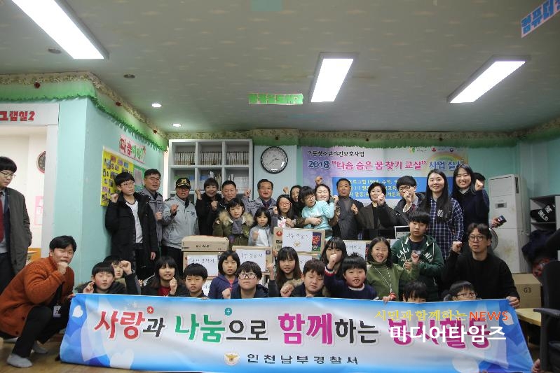 [미디어타임즈=문상수 기자] 인천남부경찰서(서장 김상철)는 설 명절 전‘사랑 나눔 위문봉사’의 일환으로 9일 경찰발전위원회와 함께‘다솜지역아동센터’를 방문하여 봉사활동 및 위문품을 전달했다.관교동에 위치한 다솜지역아동센터는 한부모, 기초생활수급, 다문화 가정 등 어려운 아동들이 입소하여 기초학습 및 문화체험 경험을 할 수 있도록 만든 시설로 이용료는 없으며 현재 24명이 생활하고 있다.이에 남부서는, 곧 있을 설 명절 나눔 봉사의 일환으로 쌀2포대, 라면6박스, 휴지, 세제 등 30만원 상당의 위문품과 시설 내·외부 청소 및 컴퓨터 4대를 교체하는 등 봉사활동을 실시했다..또한, 이날은 특별히 남부경찰서 학교전담경찰관이 참여해 아이들을 위한 범죄예방교육과 교우관계 증진을 위한 강의도 진행했다. 한편, 김은주 센터장은 “아이들에게 아름다운 추억을 만들어주어 정말 감사드린다”며 “여러분들의 도움에 힘입어 아이들이 꿈과 희망을 갖고 발전 할 수 있도록 노력하겠다”고 말했다.한편, 김상철 남부서장은 “설 명절 전 뜻깊은 봉사활동 자리를 마련해주신 센터장님과 우리 남부경찰을 밝게 환영해준 아이들에게 감사드린다”며 “일회성 봉사가 아닌 아이들이 발전 할 수 있는 지속적인 봉사를 하겠다”고 말했다.