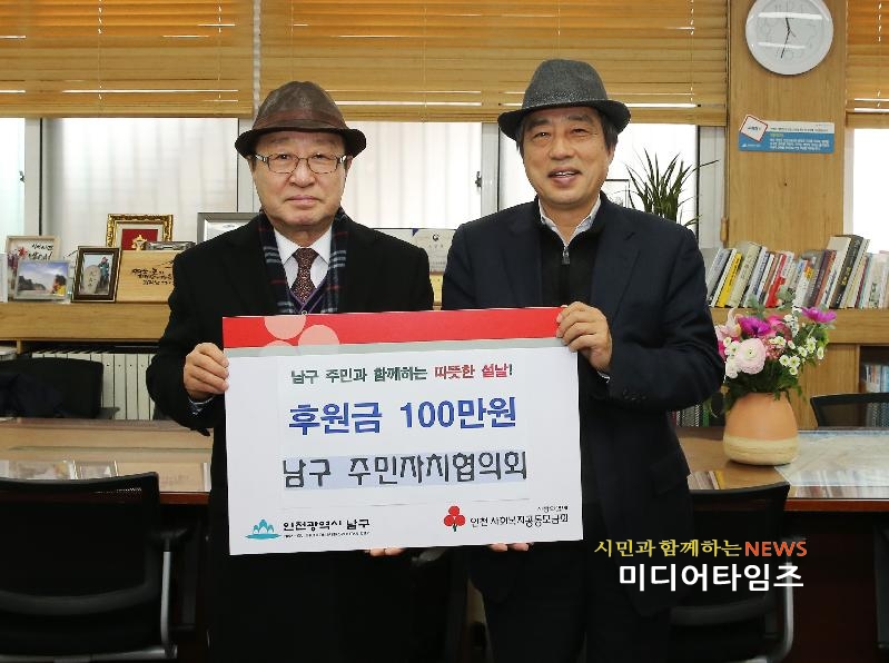 [미디어타임즈=문상수 기자] 인천 남구 주민자치협의회는 9일 어려운 이웃을 돕기 위한 성금 100만원을 전달했다.성금은 주민자치협의회 회원들이 지난해 회비를 모은 기금이다.복지사각지대에 놓인 실질적 어려움에 처한 홀몸 어르신과 한부모가정 등 10세대에 10만원씩 지급될 예정이다.주민자치협의회는 매년 설 명절 어려운 이웃을 위한 성금을 기탁하고 있다.김득웅 남구 주민자치협의회 회장은 “앞으로도 사업을 확대, 소외된 이웃에게 따뜻한 정을 나누고 싶다”고 말했다.박우섭 남구청장은 “매년 선행을 베풀고 있는 주민자치협의회에 감사드린다”며 “어려운 이웃들이 함께 잘 살 수 있는 도시가 될 수 있도록 노력하겠다”고 말했다.