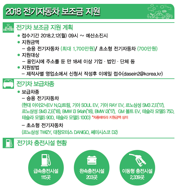신청자격은 공고일 이전 용인시에 주소를 둔 만 18세 이상 시민과 기업․법인․단체 등으로 전기자동차 제작사별 영업소에서 신청서를 작성해 담당자 이메일(dasein2@korea.kr)로 접수하면 된다.