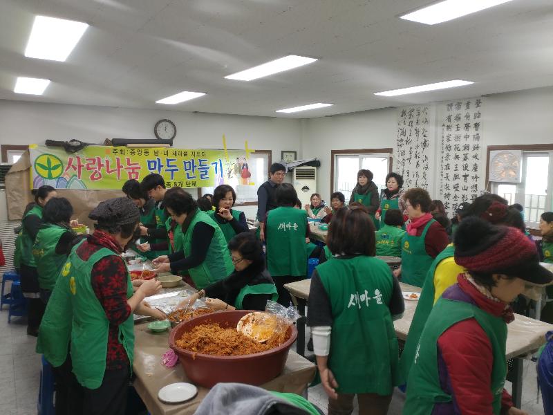 지난 추석 송편 나눔과 김장철 김장 나눔으로 이웃사랑 실천에 앞장섰던 새마을 남ㆍ녀 지도자를 중심으로 중앙동 바르게살기, 통장협의회, 체육회 등 기타 단체회원들까지 70여명이 함께 참여한 이번 행사는 보다 뜻 깊은 행사로 진행 됐으며, 이날 정성스럽게 빛은 만두는 복지사각지대에 있는 독거노인, 소년 소녀 가장, 기초생활 수급자 등 어려운 이웃 100세대에 전달할 예정이다.