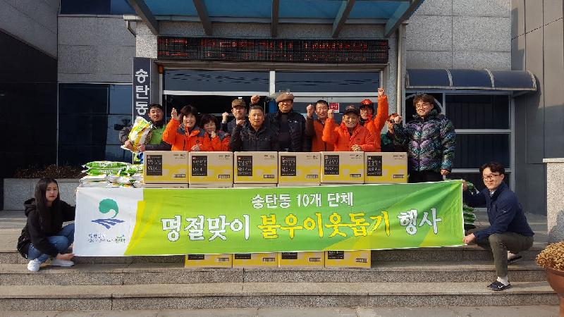 [미디어타임즈= 이옥수 기자] 평택시 송탄동(동장 박천수) 10개 단체협의회(회장 최대혁)는 9일 설 명절을 맞이해 소외계층을 지원하기 위한 사랑의 나눔 행사를 갖고 선물세트 등 기부물품(200만 원 상당)을 송탄동주민센터에 전달했다.