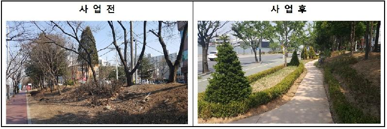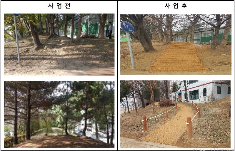 금회 정비공사를 통해 밀식된 수목 중 불량목 제거, 돌출된 뿌리 정비, 우천 시 토사가 유실되는 구간에 조경석을 쌓아 토사유실로 인한 보행 불편을 해소하고 산책로 폭 확보, 보행자 편의를 돕기 위해 야자매트를 설치해 산책하는 시민에게 안전하고 쾌적한 녹지길을 제공했다.