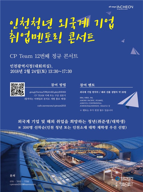 [미디어타임즈= 김광한 기자] 인천시는 외국계 기업과 해외 취업을 준비하는 인천청년을 위해 오는 24일(토) 오후1시 30분부터 인천시청 대회의실에서 ‘인천청년 외국계 기업 취업멘토링 콘서트’를 개최한다.