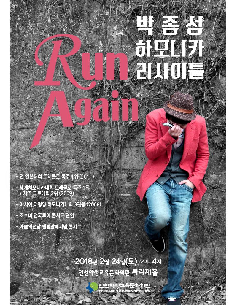[미디어타임즈= 김광한 기자] 인천학생교육문화회관(관장 김문환)은 오는 24일(토) 오후 4시에 「박종성 하모니카 리사이틀 Run Again」을 싸리재홀 무대에 올린다고 밝혔다.