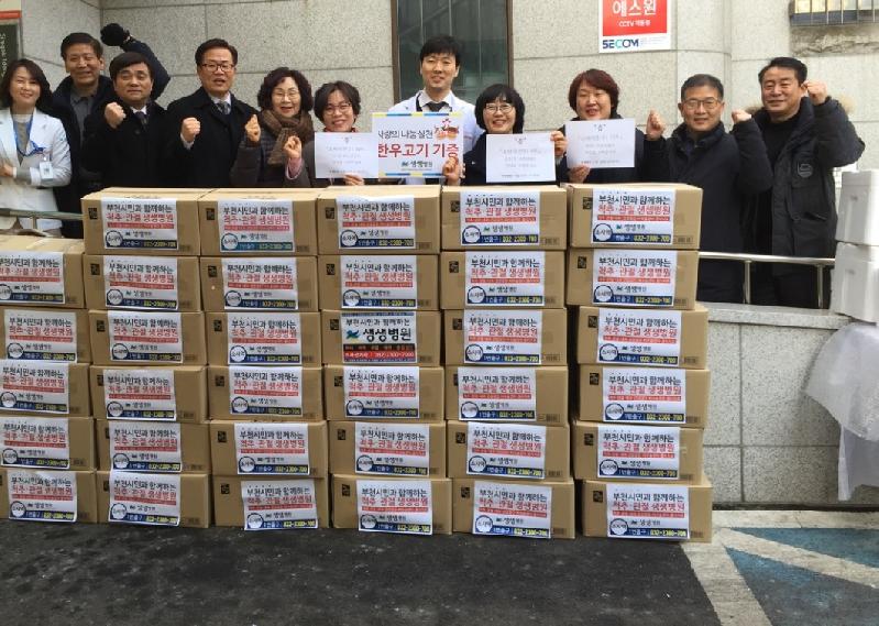 [미디어타임즈= 이옥수 기자] 지난 8일 부천시 생생병원(원장 오종양, 박범용)은 설 명절을 맞은 경로당 어르신들이 추운 겨울을 이겨내실 수 있도록 지원해달라며 한우고기 16박스를 중2동 주민센터(동장 손부희)에 전달했다.