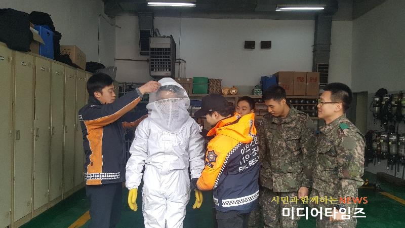 [미디어타임즈=문상수 기자] 인천서부소방서(서장 김준태)는 지난 9일 남수단으로 파병을 앞둔 한빛부대 간부 2명과 장병 4명에 벌집 제거 및 동물포획 장비 사용법 교육·훈련을 실시했다.남수단 현지에는 다수의 벌집과 야생동물로 인해 위험이 노출되어 있어 장병들의 안전을 고려하여 서부소방서 119구조대 차고 및 사무실에서 장비를 이용한 구조 및 안전확보 교육을 실시했다.교육내용으로는 ▲말벌 보호복 착용법 및 주의사항 ▲말벌용 스프레이 및 토치사용을 통한 벌집 제거법 ▲동물포획 장비 파악 및 사용법 교육 ▲동물포획 방법연찬 및 주의사항 교육 ▲각종 생활구조 현장에서 현지상황에 맞는 적응능력향상 훈련 ▲구조대원들의 다수 겪은 현장업무에 대한 노하우 전수 등이다.이날 교육받은 한빛부대원은 “이번 교육과 훈련을 통해 구조장비를 처음 접해봤으나 구조 상황에 신속히 대처할 수 있도록 성의껏 교육해준 서부119구조대에 감사하며, 남수단에 파견가서도 교육받은 내용을 꾸준히 연습하여 활용 할 수 있도록 노력하겠다”고 전했다.