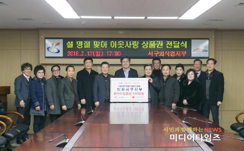 | 한국외식업중앙회 인천광역시지회 서구지부 설 명절 맞이 이웃사랑 성품 기탁 사진. <ⓒ미디어타임즈> |