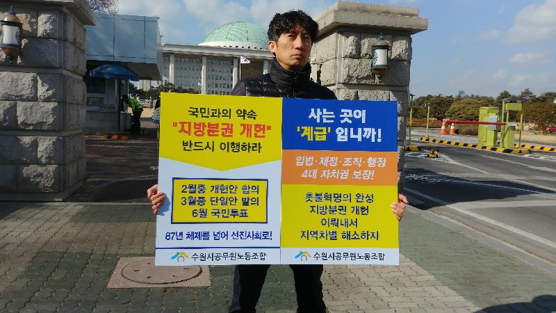 최창석 수원시공무원노동조합위원장은 13일 국회 정문 앞에서 ‘지방분권 개헌 촉구를 위한 1일 릴레이 시위’에 동참했다.