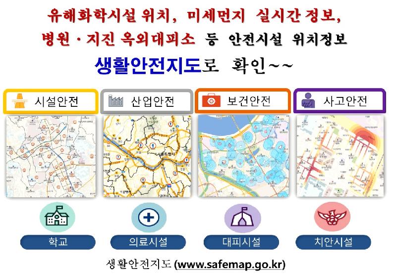 생활안전지도는 국민생활안전과 밀접한 범죄와 교통사고 발생현황, 대피시설, 미세먼지 등 안전정보 200여 종을 한 곳에 모아 지도형태로 시각화한 것이다.
