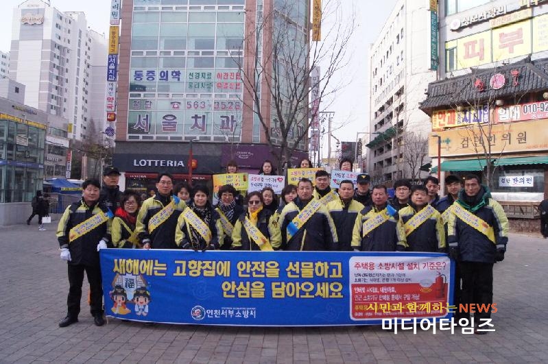 [미디어타임즈=문상수 기자] 인천서부소방서(서장 김준태)는 14일 설 연휴를 앞두고 '고향집, 주택용 소방시설 선물하기' 집중 홍보에 나섰다. 설 연휴 기간 집중 홍보를 위해 관내 전광판 시설을 활용한 홍보슬로건 ‘새해에는 고향집에 안전을 선물하고 안심을 담아오세요’를 송출했으며, 관내 역사인 서구청역, 검암역, 완정역에서 ‘주택용 소방시설 선물하기 홍보 캠페인’을 펼쳤다.또한 서구청역에서는 ‘소방안전 체험부스’를 활용한 주택용 소방시설 의무 설치를 안내하고 심폐소생술을 교육했다.주택용 소방시설인 소화기는 화재초기에 소방차 1대 역할을 하며, 단독경보형 감지기는 화재를 감지하면 경보를 울려 신속하게 대피할 수 있도록 하여 인명피해를 줄일 수 있다.김준태 서장은 "주택용 소방시설은 초기 화재 진화에 가장 중요한 역할을 한다.”며 "이번 설에는 고향집에 주택용 소방시설을 선물해 가족들의 안전을 지켜주며 따뜻한 설 명절이 되길 바란다”고 말했다.