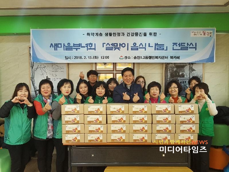 [미디어타임즈=문상수 기자] 인천 동구 송현1․2동(동장 김진기)은 지난13일, 관내 독거노인 등 저소득가정의 따뜻한 설 맞이를 위해‘설맞이 음식 나눔 행사’를 가졌다. 이번 나눔 행사는 새마을부녀회(회장 김경순) 주관으로 마련됐으며, 지난 1월 만두 나눔 행사에 이어 민족 최대 명절인 설을 맞이해 저소득 취약계층의 마음의 빈자리를 채우기 위해 추진됐다.이번 나눔 활동은 부녀회원들이 제작한 재활용비누 및 폐휴지를 판매한 수익금으로 마련됐다.부녀회원들은 직접 시장에서 떡과 고기 등 질 좋은 재료를 구입해 정성을 담아 포장했으며, 독거노인 가구 등 결식우려가 있는 25세대를 가가호호 방문해 따뜻한 명절 인사를 전하며 직접 전달하는 시간을 가졌다. 김경순 회장은 “관내 어르신들께서 정성껏 준비한 설맞이 음식을 맛있게 드시고 추운 겨울을 이겨내고 항상 건강하시길 바란다”며, “앞으로도 꾸준히 사랑의 반찬 나눔 활동을 추진할 것”이라고 밝혔다.한편, 김진기 송현1․2동장은 재능기부를 통해 진정한 나눔을 실천해준 새마을부녀회원들에게 감사의 인사를 전하며 “고령화 사회를 맞아 소외된 주변 독거 어르신가정에 지속적인 관심과 배려로 따뜻한 정을 나누는 송현1․2동을 만들기 위해 최선을 다할 것 ”이라고 말했다.