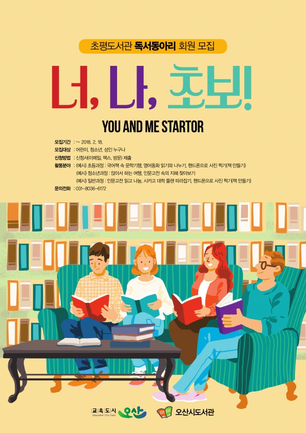초평 독서동아리 회원으로 신청하고자 하는 사람은 오산시도서관 홈페이지에서 신청서를 다운로드 받은 후 방문, 팩스, 이메일 발송의 방법으로 제출하면 되고, 자세한 사항은 초평도서관(☎031-8036-6172)으로 문의하면 된다.