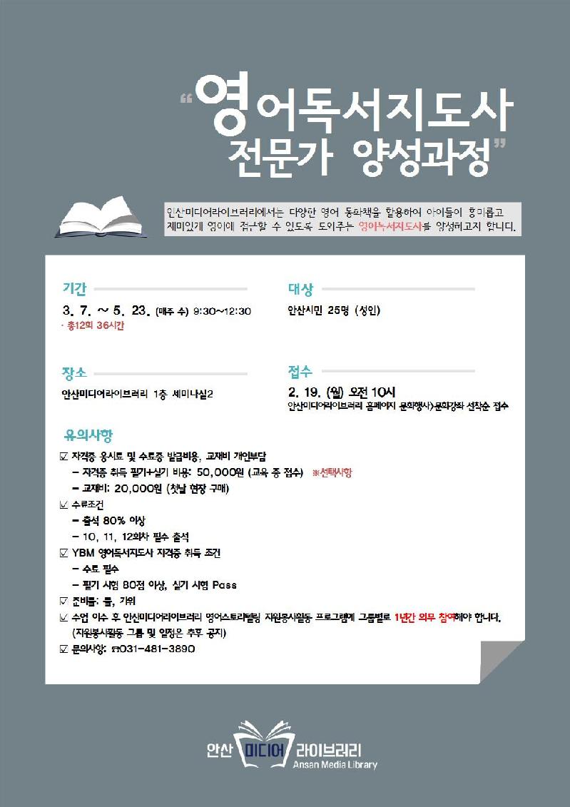또한 과정 이수 후에는 안산미디어라이브러리에서 1년간 영어동화 스토리텔링 자원봉사 활동에 참여해야 한다.