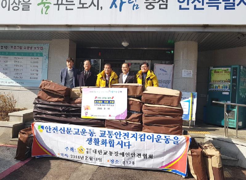 [미디어타임즈= 신훈종 기자] 안산시 본오2동 행정복지센터(동장 윤교엽)는 지난 13일 대한교통장애인안전협회(회장 송병헌) 후원으로 추운겨울을 지내고 있는 독거노인과 교통사고로 인해 몸이 불편한 장애인을 위한 전기매트 전달식을 가졌다.