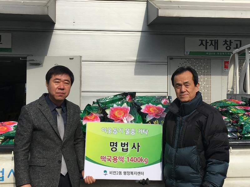 [미디어타임즈= 이옥수 기자] 평택시 명법사(회주 화정스님)는 지난 12일 비전2동행정복지센터(동장 최중범)에 관내 어려운 이웃들과 함께 나눌 설맞이 떡국떡 350포(980만원 상당)를 기탁했다.