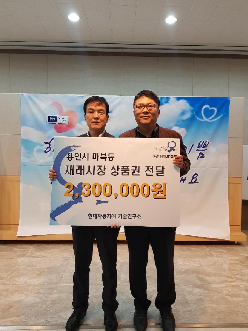 [미디어타임즈= 이옥수 기자] 용인시 기흥구 마북동은 지난 12일 관내 소재한 현대자동차㈜ 남양연구소에서 연말연시 이웃돕기 운동인 ‘사랑의 열차 이어달리기’에 230만원의 전통시장 온누리상품권을 기탁했다고 밝혔다.