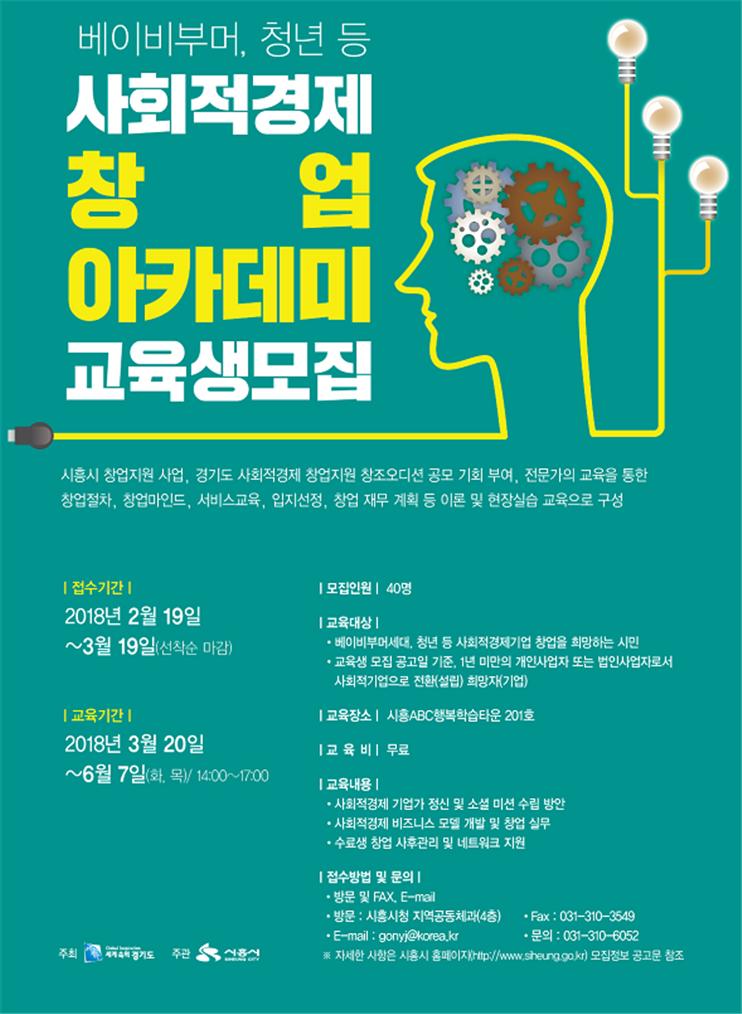 ‘사회적경제 창업 아카데미’는 사회적경제 기업 창업에 관심 있는 시흥시민이라면 누구나 참여할 수 있다. 시흥시는 이번 아카데미를 통해 혁신적인 사회적기업 창업 아이템을 가지고 지역 문제를 해결하고자 하는 인재를 발굴 및 육성하고자 한다.