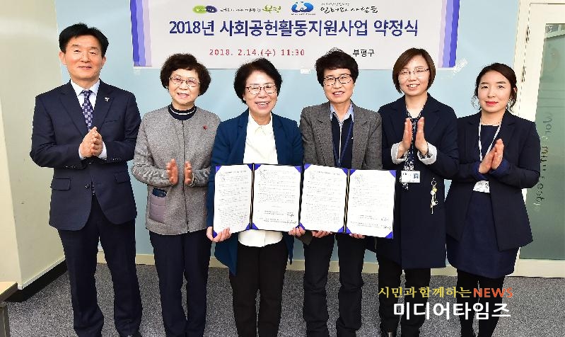 [미디어타임즈=문상수 기자] 인천시 부평구(구청장 홍미영)는 지난 14일 사회적협동조합 일터와 사람들(이사장 원미정)과 ‘2018년 사회공헌활동 지원 사업 약정식’을 갖고 본격적인 사업 진행에 들어갔다. 사회공헌활동 지원 사업은 만 50세 이상 퇴직 전문 인력이 자신의 지식과 경력을 활용, 비영리 기관․단체 등에서 봉사적 성격의 활동을 할 수 있도록 참여 실비 등을 지원하는 것으로 지난해 고용노동부에서 전국 지방자치단체를 대상으로 공모한 프로그램이다. 부평구는 사회적협동조합 일터와사람들과 컨소시엄을 구성해 사업에 응모, ▲사업수행 능력 ▲사업 내용 적정성 ▲사회공헌활동 사업에 대한 이해 등 3개 부문의 심사기준을 통과해 4년 연속 사업주관 지자체로 최종 선정됐다. 이 결과 7,700만원의 국비 예산을 지원받았다.일터와 사람들은 조속한 사업추진을 위해 3월부터 퇴직 전문 인력과 수요기관 발굴을 시작으로 본격적으로 사업에 나설 계획이다.선발된 참여자들은 사전에 소정의 교육 받은 후 부평구 지역 내 사회적기업과 공공기관, 복지시설, 비영리단체 등에 배치돼 오는 12월 31일까지 활동하게 된다.