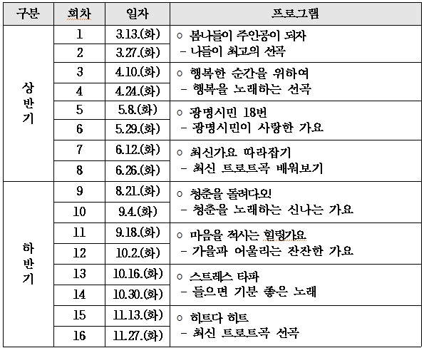 이에 올해는 광명문화재단의 주최, 주관하고 티브로드 한빛방송이 제작하여 콘셉트와 내용에 새롭게 변화를 꾀할 예정이다. 기존의 1인 강사를 중심으로 구성된 노래교실 형식에서 다양한 코너와 초대손님이 함께 꾸며가는 노래 콘서트 형식으로 프로그램의 질과 재미를 높였다.