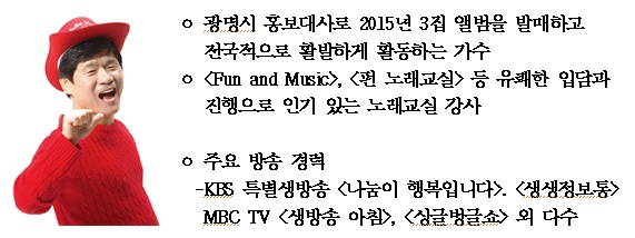 이번 ‘노래 콘서트’의 진행과 노래 강사 역할은 광명시 홍보대사 ‘피터펀’이 맡게 된다. ‘피터펀’은 3집 앨범을 내고 활발하게 활동하고 있는 가수이자 노래교실 강사로도 알려져 있다. 재치 있는 입담과 유쾌한 에너지를 가진 ‘피터펀’의 진행으로 웃음과 재미가 한층 더해질 예정이다.
