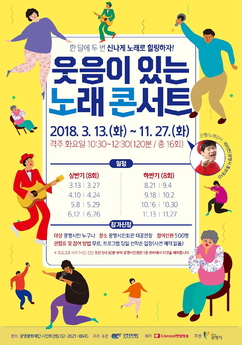 [미디어타임즈= 신훈종 기자] 광명문화재단은 ‘웃음이 있는 노래 콘서트’(이하‘노래 콘서트’)를 3월 13일(화)부터 11월 27일(화)까지 총16회에 걸쳐 광명시민회관 대공연장에서 개최한다.