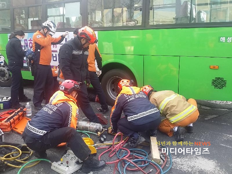 | 부평소방서, 버스아래깔린 교통사고 인명구조 사진. <ⓒ미디어타임즈> |
